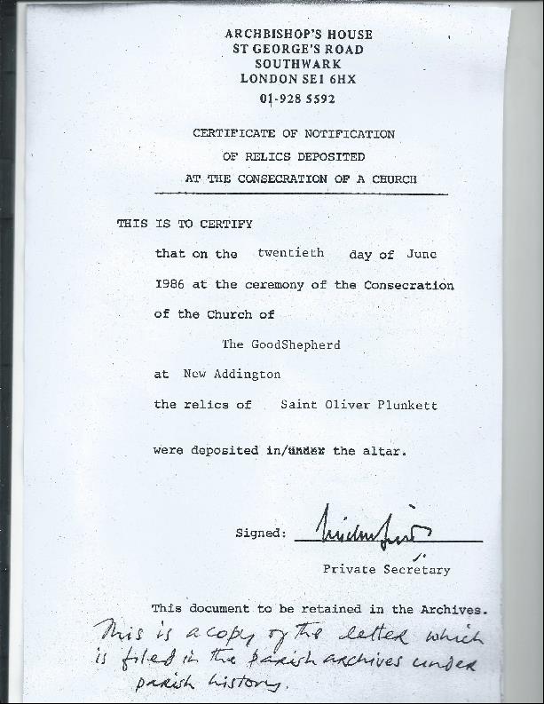 Copy of certificate of notification of relics deposited at the consecration of our Church in June 1986: